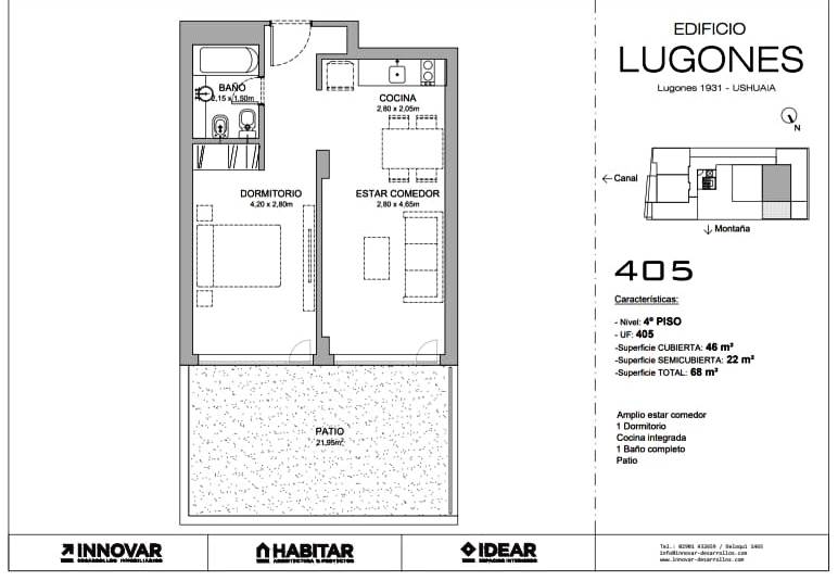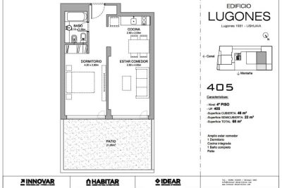 Este excelente departamento de 46.25m² cubiertos con un patio de 21.95m2, contará con todo el mobiliario de cocina, horno y anafe eléctrico, baño principal completo, calefacción por losa radiante y cortinas en todos los ambientes. Habitación con placares empotrados y puertas espejadas de piso a techo.