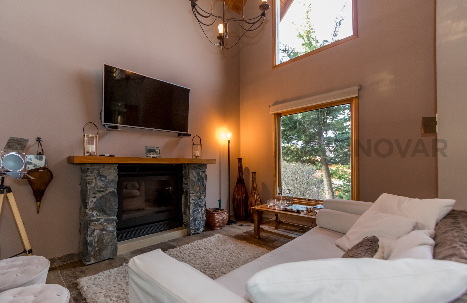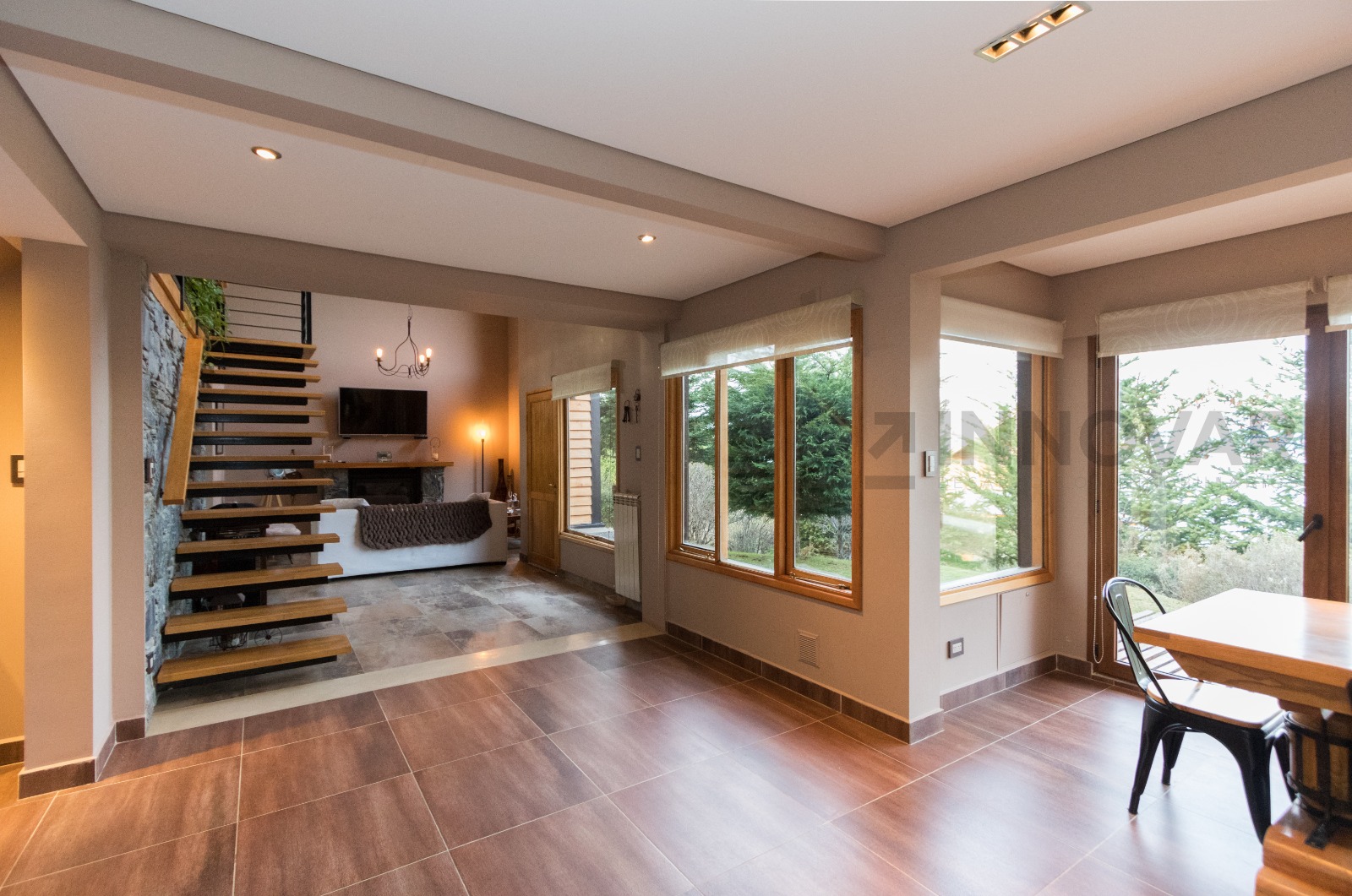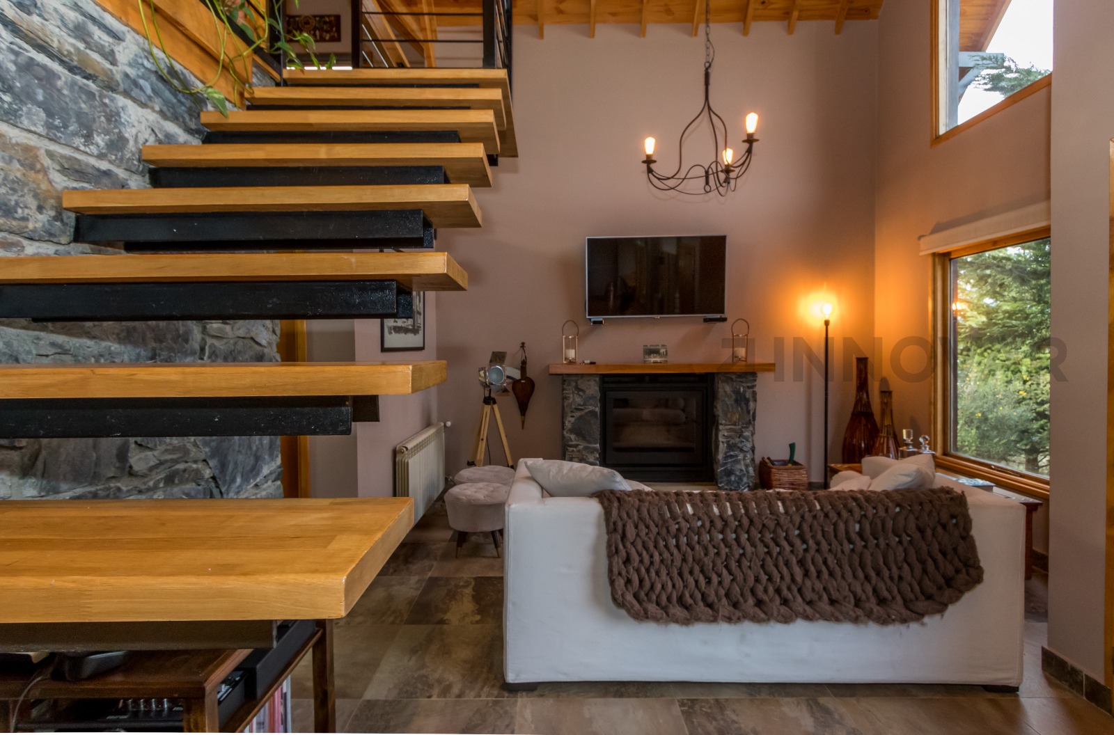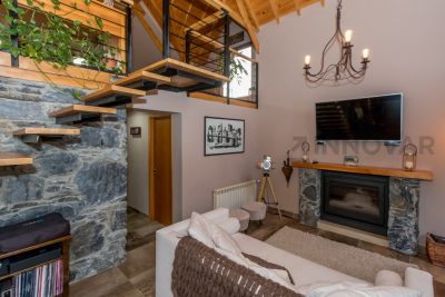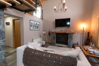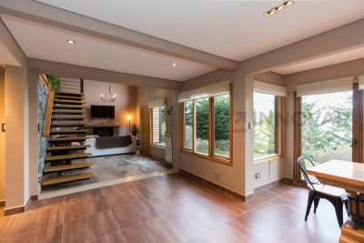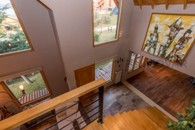 • Planta Principal: Hall de ingreso, amplio living con hogar a leña revestido en piedra, techos de doble altura con tirantería a la vista y grandes ventanales que integran el paisaje exterior.​