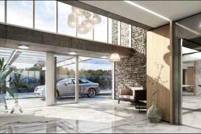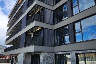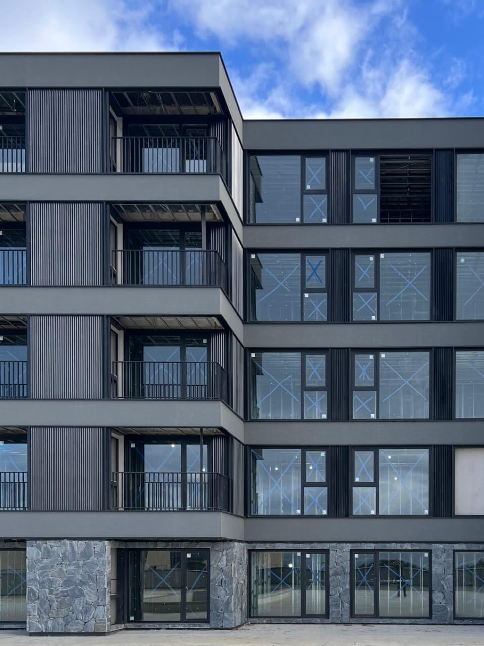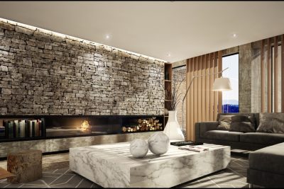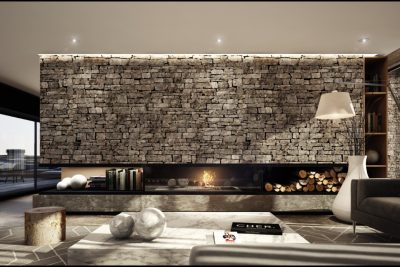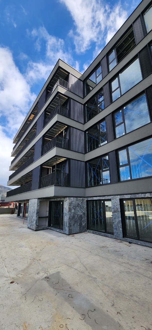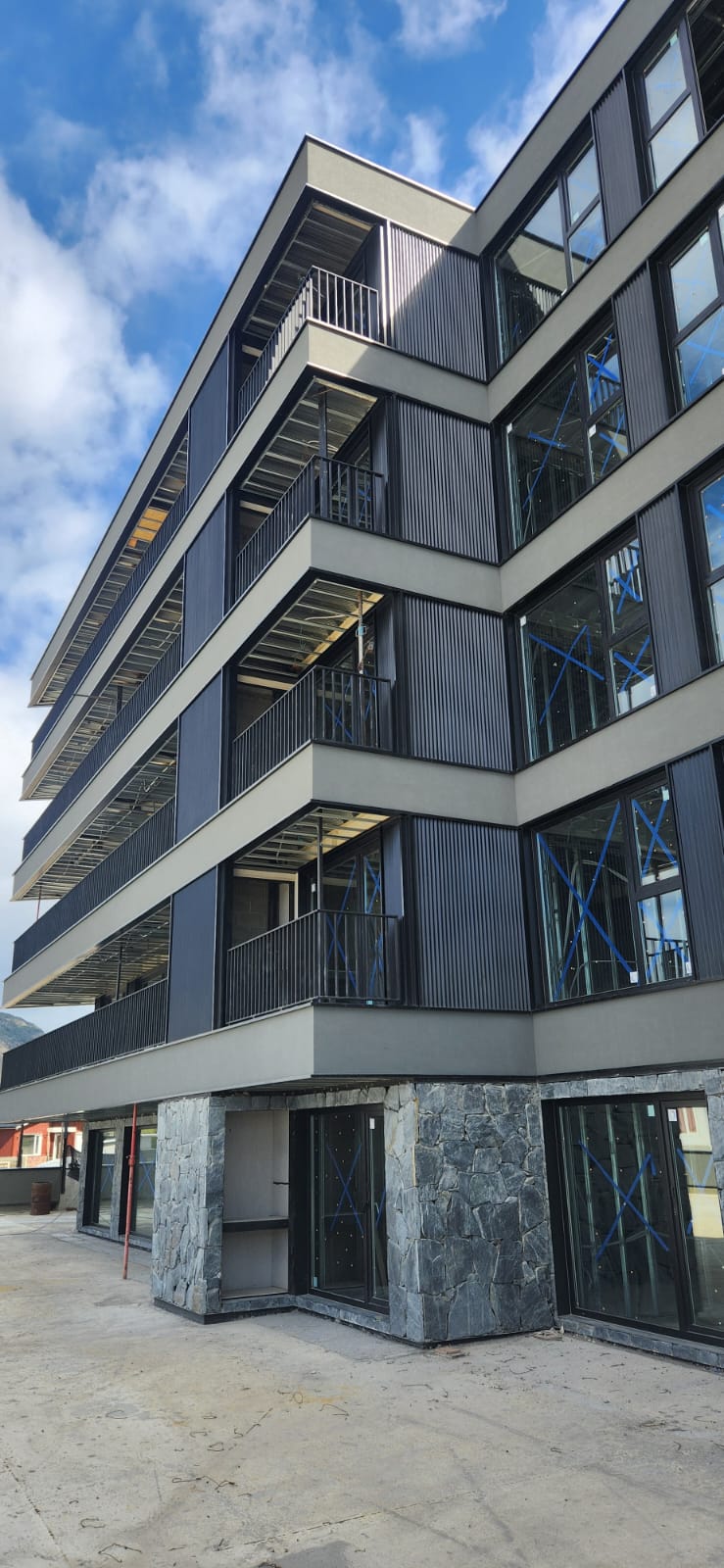 Exteriores en piedra, hormigón visto, placas cementicias y/o mampostería con bloques cementicios. Al interior revestido en placas de yeso (sistema durlock o equivalente) con aislación térmica y acústica.
