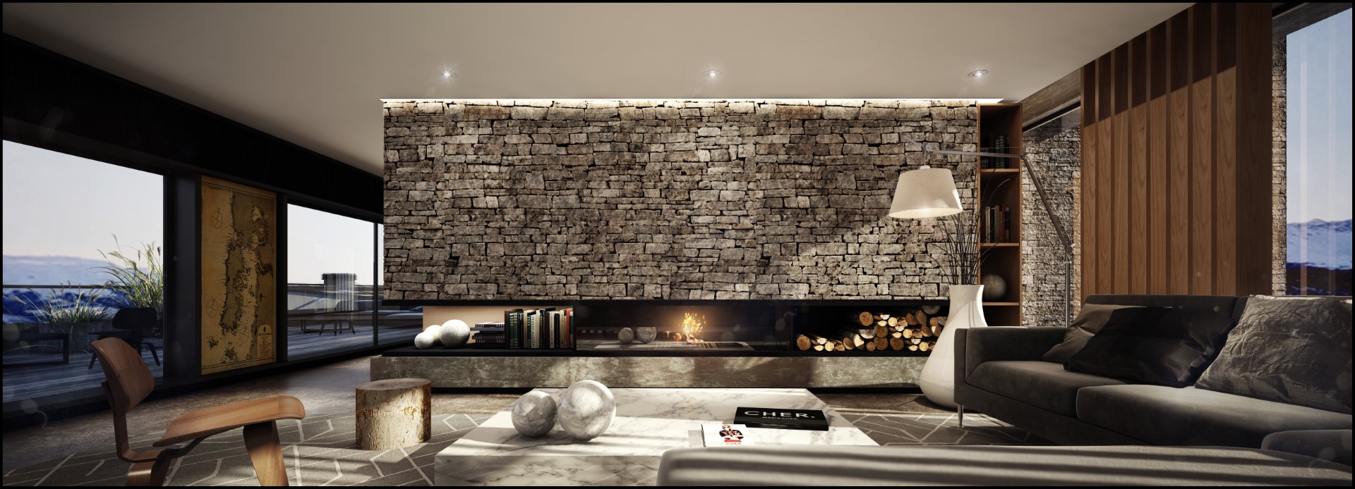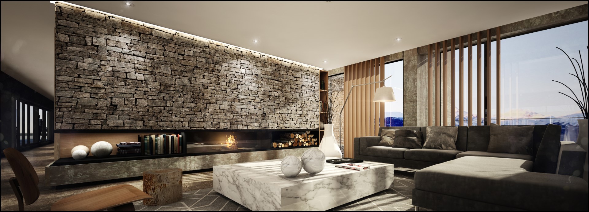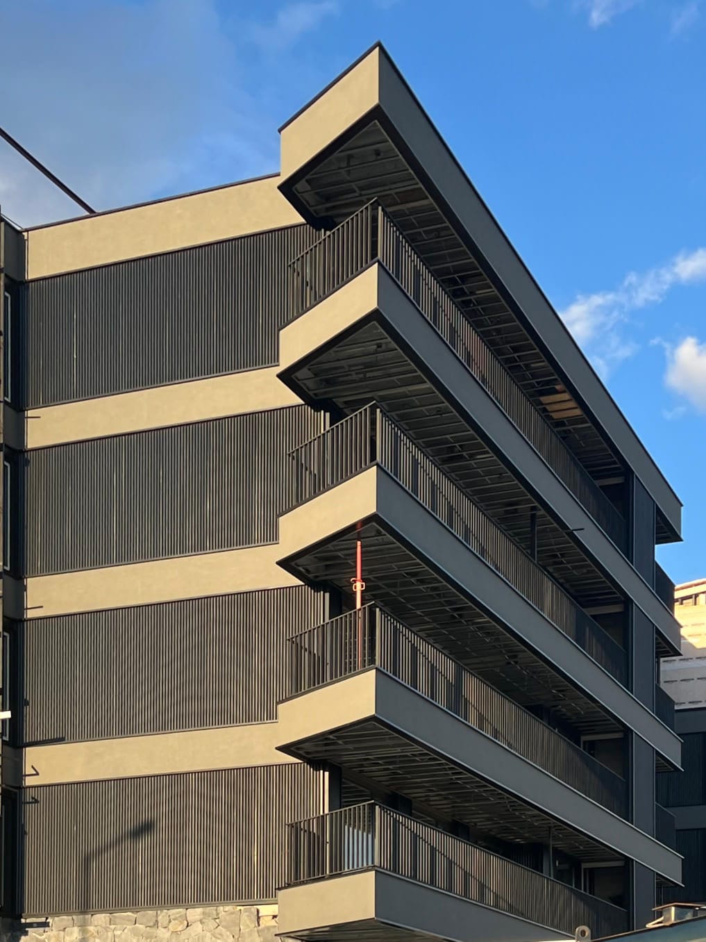 Exteriores en piedra, hormigón visto, placas cementicias y/o mampostería con bloques cementicios. Al interior revestido en placas de yeso (sistema durlock o equivalente) con aislación térmica y acústica.