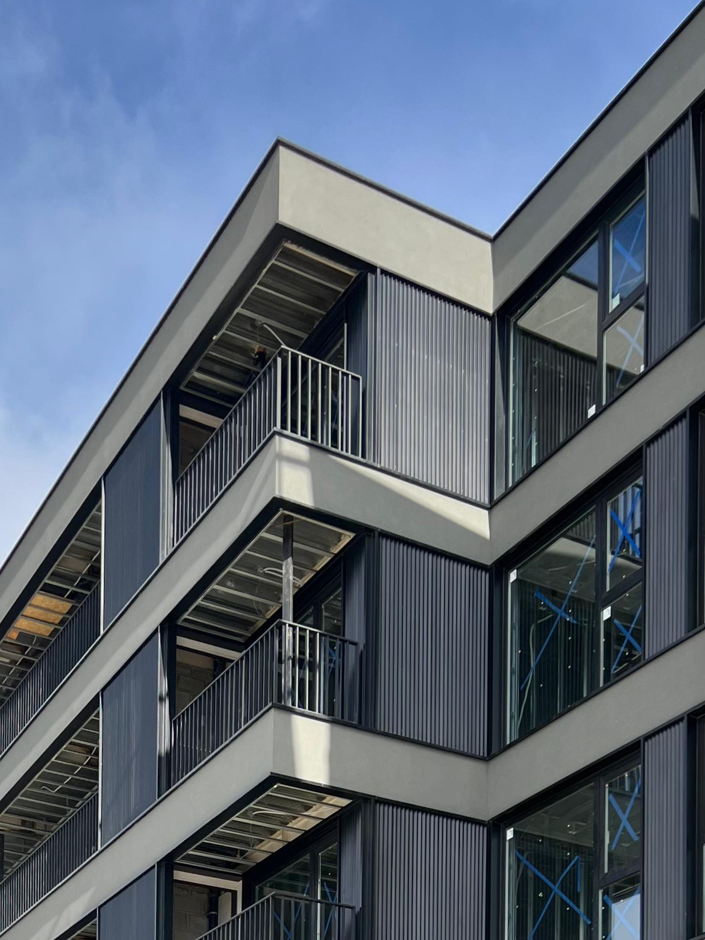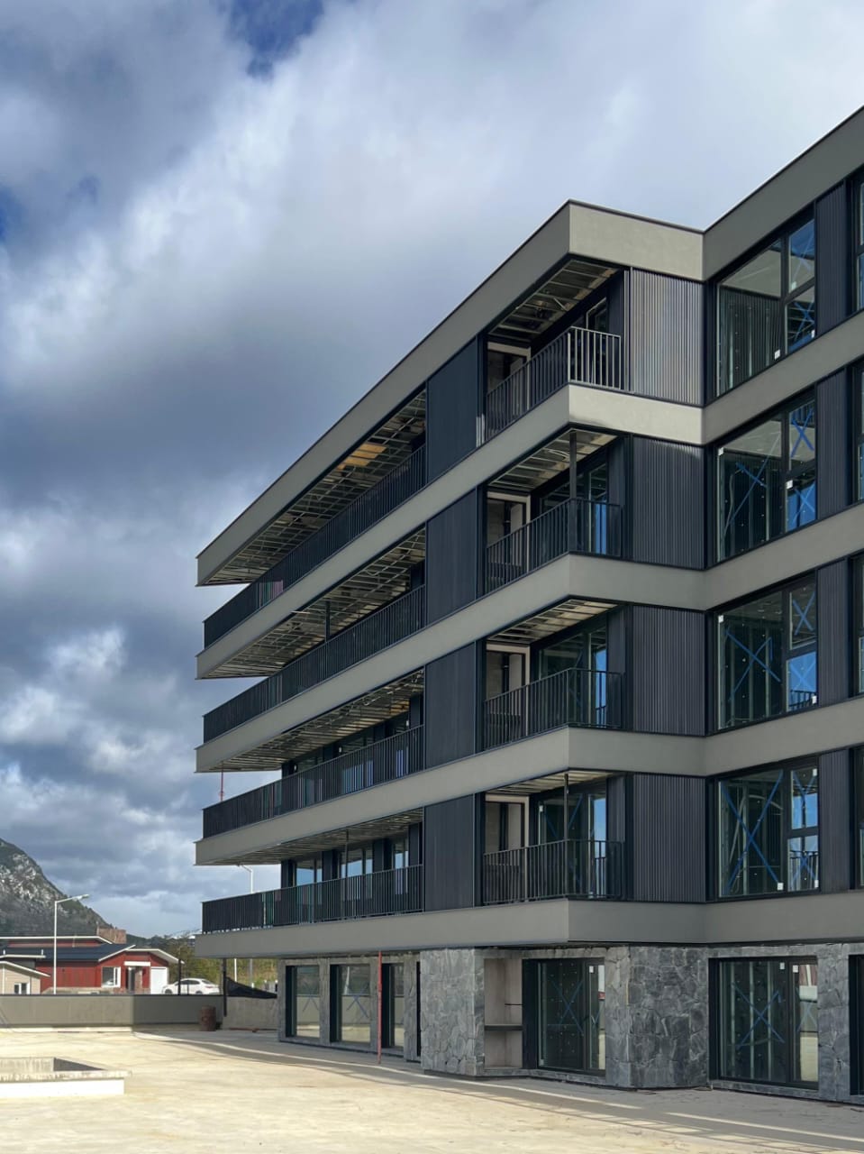Exteriores en placas cementicias y/o mampostería con bloques cementicios, con revestimiento de base acrilica (tipo revear o similar), chapa y piedra.