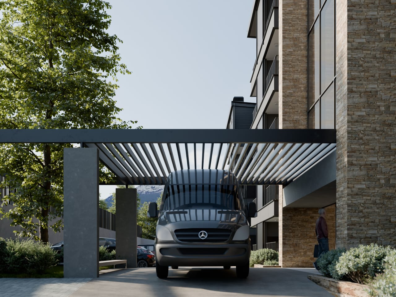 Balcones y terrazas, hall principal, acceso peatonal, calle vehicular de ingreso a cocheras y veredas municipales calefaccionadas con sistema de losa radiante o piso radiante eléctrico.